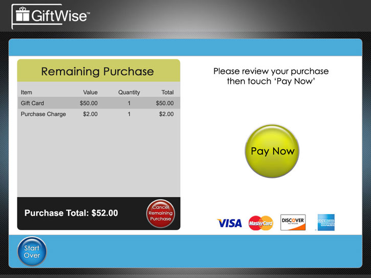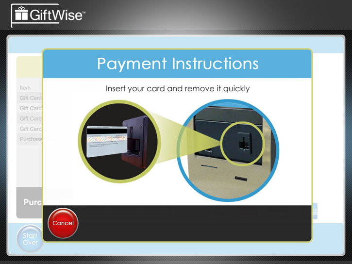 GiftWise is a user friendly gift card distribution kiosk found at malls and outlets. Users can check their gift card balance, purchase one or more gift card at a time in any denomination, and can sign up for coupons and offers.