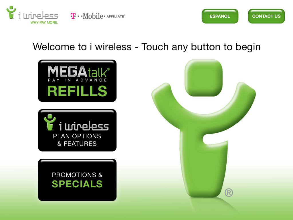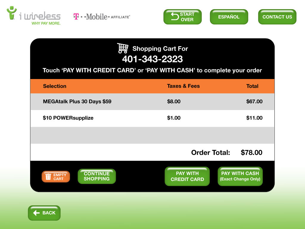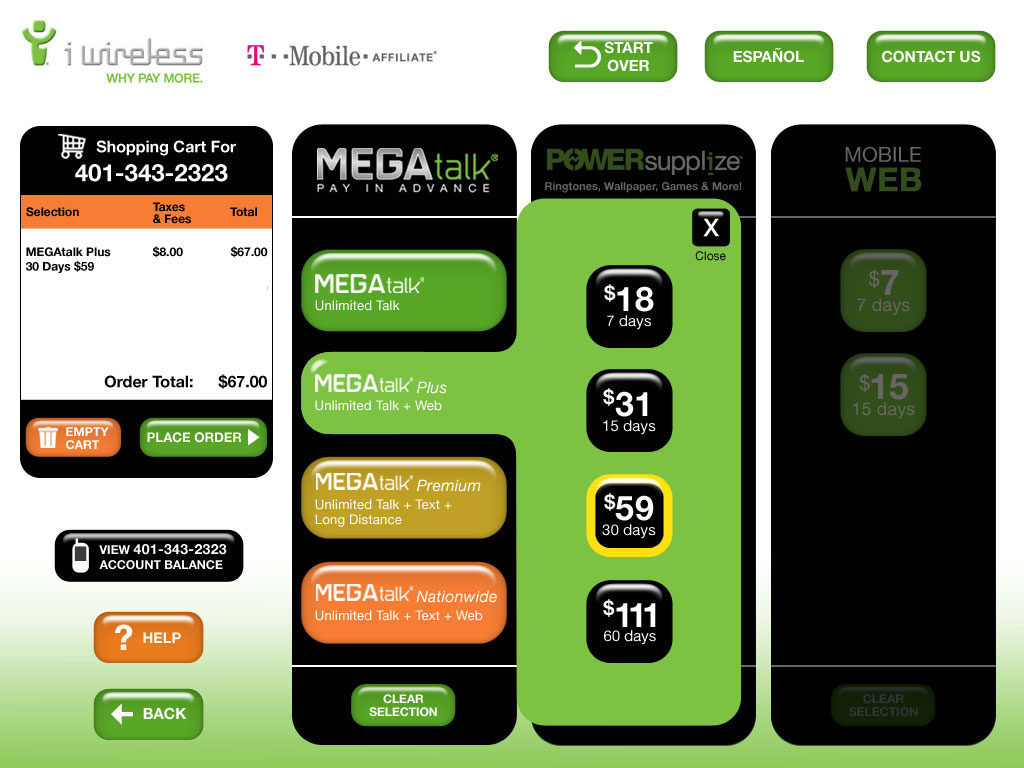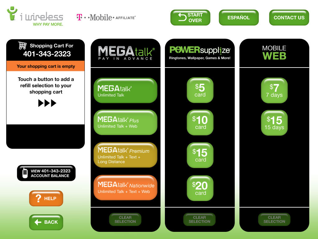 iWireless, a mobile phone carrier wanted a kiosk where their customers could easily purchase plans including talk, data, ringtones, and other options. Users can select the plan they want and the amount or can check their current prepaid balance.